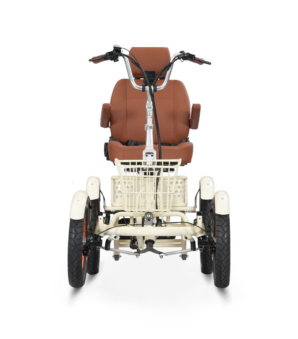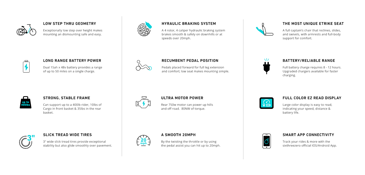 Unlike traditional bikes and even trikes, the Quad design provides maximum balance and control. The dual 20” x 3” rear tires and dual 16” x 3” front tires make this e-bike equally at home on smooth pavement and uneven trails. The unique tilting front steering system keeps both front wheels in constant contact with the ground—when one wheel goes up, the other stays down. The result is smoother, safer turns and the most stable e-bike ride on the market—far beyond what any three-wheeler can offer.
